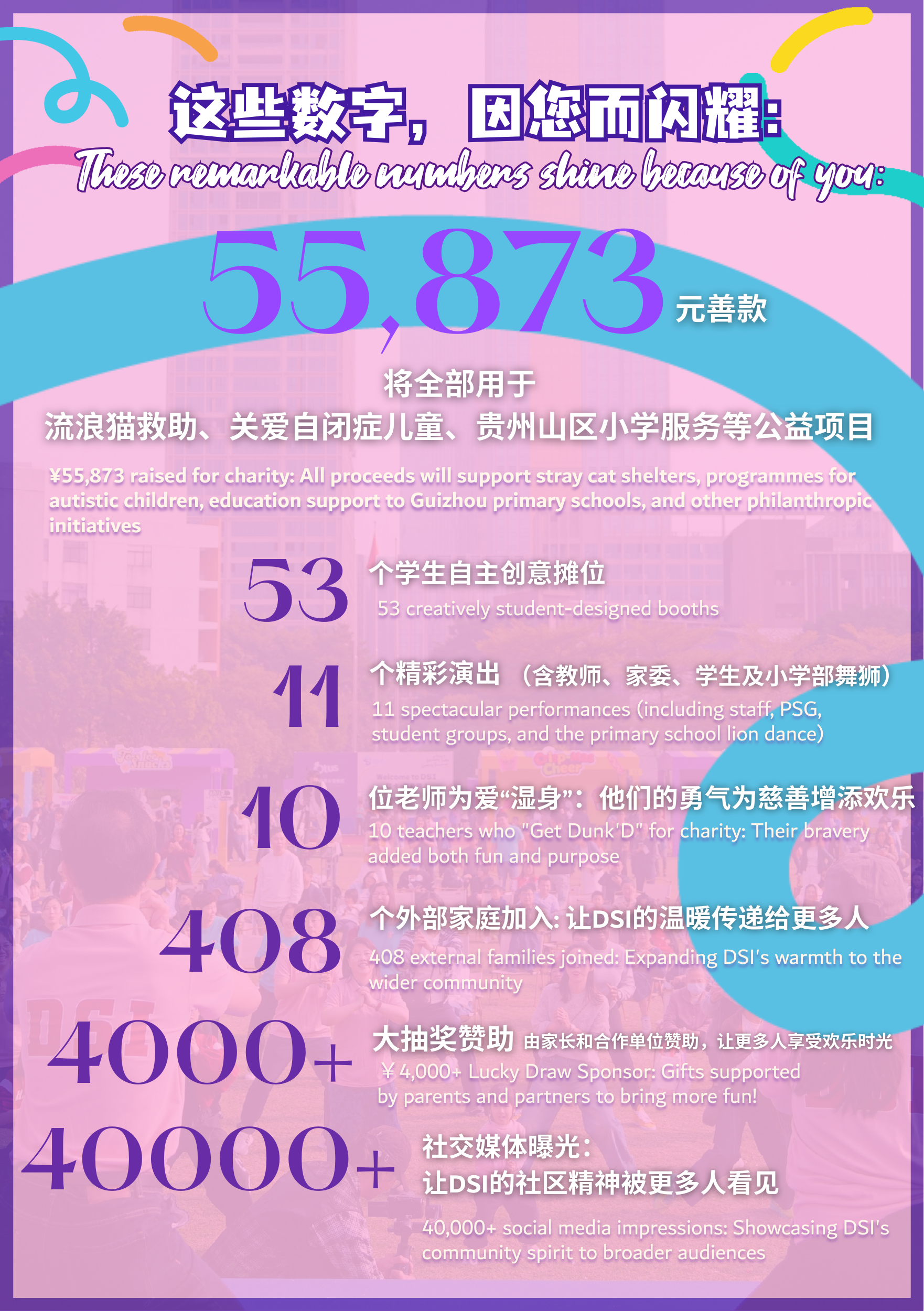 我们希望通过G.E.T. DSI,为学生们创造一个真实的实践平台。从策划摊位到经营“生意”,从才艺展示到团队协作,他们在欢笑中收获了课本之外的成长。而老师们勇敢参与“水桶挑战”(为慈善筹款而“湿身”),家委们倾情演出,家长朋友们热情支持,都让这一天成为真正的社区共育时刻。
